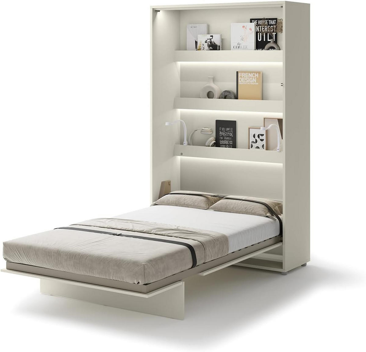[PLATZSPAREND] - Das vertikale Schrankbett ist eine innovative Lösung, um im Haushalt Platz zu sparen. Seine Tiefe beträgt nach dem Falten nur 46 cm. Das Bett hat einen stabilen Metallrahmen und ein flexibles Holzgestell Im Set enthalten ist eine Sieben-Zonen atmungsaktive Taschenfederkernmatratze mit einer Höhe von 17 cm mit Kokosmatte und zwei Härtegraden - auf der einen Seite H2, und auf der anderen H3 [HALBAUTOMATISCHER PNEUMATISCHER MECHANISMUS] - Ein eingebauter, leiser und sicherer Mechanismus mit Gasfedern und dem SOFT-CLOSE-System bedeutet, dass nicht viel Kraft erforderlich ist, um das Wandbett zu bedienen, und das meiste geschieht automatisch (Anheben und Absenken). Verstellbare Schnallengurte und ein Stabilisator verhindern das Verrutschen der Matratze und Bettwäsche beim Zusammen- und Auseinanderklappen [PRAKTISCHE ABLAGEN] - Drei 8 cm tiefe Ablagen ermöglichen die Aufbewahrung von Gegenständen, die Sie morgens oder abends benötigen, wie z. B. Ihr Smartphone, Ihre Smartwatch/Uhr, Kopfhörer, Bücher oder Fotos Ihrer Liebsten. Für die Ablagen und Seiten ist optional eine LED-Ambientebeleuchtung (einschließlich flexibler Lese-Nachtlichter mit USB-Ladeanschluss) erhältlich [HOCHSCHRANKSYSTEM] - Neben dem Schrankbett und der LED-Ambientebeleuchtung umfasst das Bed Concept-System auch spezielle vertikale hohe Hockschränke mit Regalen, Nischen und Schubladen. Kompatible Hockschränke: BC-07, BC-08 sind erhältlich. Das Bed Concept-System wurde mit der Goldmedaille der Internationalen Messe Poznan 2019 ausgezeichnetInstallationsmethode: Wandmontiert. Befestigung: mit 8 Dübeln für die Wand (nicht Gipskarton!), die Dübel müssen je nach Wandstärke separat gekauft werden. Verpackung: