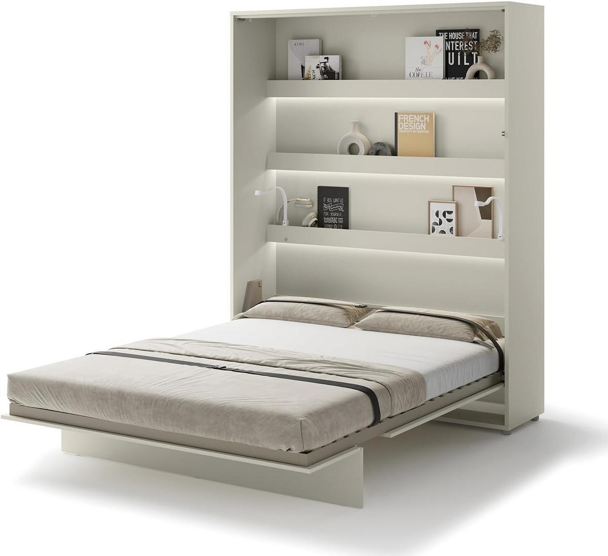 [PLATZSPAREND] - Das vertikale Schrankbett ist eine innovative Lösung, um im Haushalt Platz zu sparen. Seine Tiefe beträgt nach dem Falten nur 46 cm. Das Bett hat einen stabilen Metallrahmen und ein flexibles Holzgestell. Der stabile Korpus steht auf geschraubten Füßen und besteht aus laminierter Möbelplatte (oben und unten 22 mm, Seiten 16 mm), die Vorderseite aus 16 mm starkem laminiertem MDF und die Rückseite aus 3 mm starkem HDF [HALBAUTOMATISCHER PNEUMATISCHER MECHANISMUS] - Ein eingebauter, leiser und sicherer Mechanismus mit Gasfedern und dem SOFT-CLOSE-System bedeutet, dass nicht viel Kraft erforderlich ist, um das Wandbett zu bedienen, und das meiste geschieht automatisch (Anheben und Absenken). Verstellbare Schnallengurte und ein Stabilisator verhindern das Verrutschen der Matratze und Bettwäsche beim Zusammen- und Auseinanderklappen [PRAKTISCHE ABLAGEN] - Drei 8 cm tiefe Ablagen ermöglichen die Aufbewahrung von Gegenständen, die Sie morgens oder abends benötigen, wie z. B. Ihr Smartphone, Ihre Smartwatch/Uhr, Kopfhörer, Bücher oder Fotos Ihrer Liebsten. Für die Ablagen und Seiten ist optional eine LED-Ambientebeleuchtung (einschließlich flexibler Lese-Nachtlichter mit USB-Ladeanschluss) erhältlich [HOCHSCHRANKSYSTEM] - Neben dem Schrankbett und der LED-Ambientebeleuchtung umfasst das Bed Concept-System auch spezielle vertikale hohe Hockschränke mit Regalen, Nischen und Schubladen. Kompatible Hockschränke: BC-07, BC-08 sind erhältlich. Das Bed Concept-System wurde mit der Goldmedaille der Internationalen Messe Poznan 2019 ausgezeichnetInstallationsmethode: Wandmontiert. Befestigung: mit 8 Dübeln für die Wand (nicht Gipskarton!), die Dübel müssen je nach Wandstärke separat gekauft werden. Verpackung:
