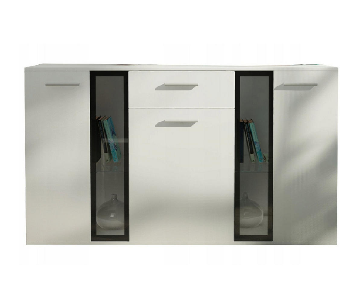 Eine moderne CERES-Kommode aus laminierter Möbelplatte, mit PVC-Leiste, silbernen Stilgriffen, hochwertigen Materialien und professioneller, präziser Verarbeitung. Der Schließmechanismus der Schubladen sind Metallrollenführungen. Die Kommode ist perfekt für Liebhaber von minimalistischen, geometrischen Formen.