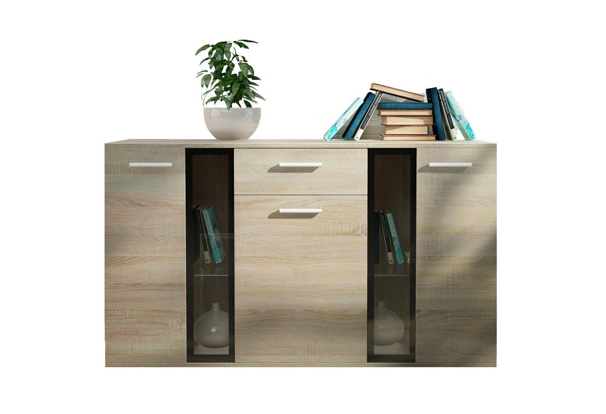 Eine moderne CERES-Kommode aus laminierter Möbelplatte, mit PVC-Leiste, silbernen Stilgriffen, hochwertigen Materialien und professioneller, präziser Verarbeitung. Der Schließmechanismus der Schubladen sind Metallrollenführungen. Die Kommode ist perfekt für Liebhaber von minimalistischen, geometrischen Formen.