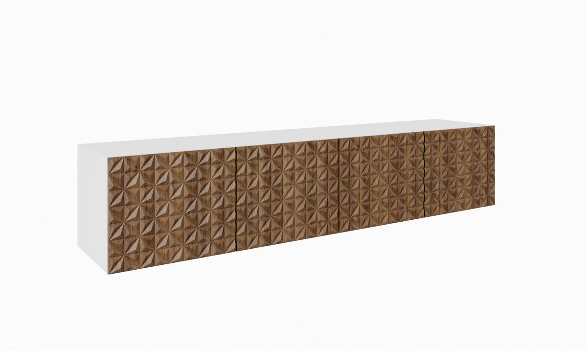 Das Modell verfügt über verschließbare Schränke mit praktischen Regalen, in denen Sie Elektronikgeräte, Multimedia-Zubehör oder andere Kleinigkeiten bequem verstauen können. Dank seiner soliden Konstruktion garantiert der Schrank Langlebigkeit und Komfort im täglichen Gebrauch.