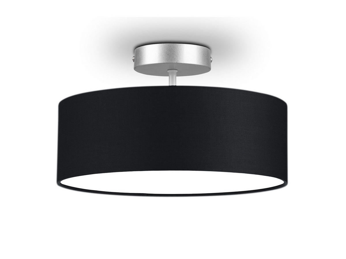 Diese angesagte Stoff Deckenleuchte aus dem Hause meineWunschleuchte ergänzt mit ihrem modernen Design und dem dekorativen Stoff Lampenschirm stilvoll Ihren Wohnraum.Das zeitlose Erscheinungsbild der runden Stofflampe sorgt im Zusammenspiel mit der weißen Kunststoffabdeckung für ein angenehmes, blendfreies Licht Ambiente. Der schwarze Stoff Lampenschirm hat einen Durchmesser von 30 cm und zusammen mit dem Sockel in matt Silber ist die Leuchte 16 cm hoch.Diese klassische Deckenlampe ist vielseitig einsetzbar und fügt sich perfekt in die unterschiedlichsten Einrichtungsstile ein: Ob als zeitgemäße Deckenbeleuchtung fürs Wohnzimmer, als Schlafzimmerlampe und als schöne Flurlampe.Die Deckenleuchte CALMA ist mit zwei E14 Fassungen ausgestattet und kann mit Leuchtmitteln bis max. je 28 Watt bestückt werden. Diese sind nicht mit im Lieferumfang enthalten. Bei Verwendung von dimmbarem Leuchtmittel ist die Deckenlampe über Ihre Hausinstallation dimmbar
