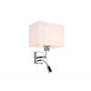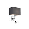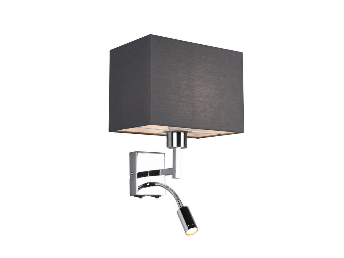 Die Wandleuchte CAIMA aus dem Hause meineWunschleuchte erzeugt durch ihren eckigen Lampenschirm aus Stoff eine angenehme Beleuchtung und sorgt mit ihrer schwenkbaren Leselampe gleichzeitig für effizientes Leselicht.Die Leuchte ist aus Metall in Chrom gefertigt und steht in gelungener Harmonie zu dem eleganten Lampenschirm aus Stoff in Grau mit einer Breite von 25 cm. Mit einer Gesamthöhe von 31 cm sowie einer Wandausladung von 24 cm passt sich die Lampe ihrer Umgebung dezent an und sorgt für ein gemütliches Licht.Besonders praktisch ist die flexibel einstellbare Leseleuchte mit einer Leistung von 3,1 Watt und 310 Lumen in Warmweiß. So haben Sie zusätzlich ein effektives und gezieltes Leselicht, wobei sich die beiden Lichtquellen über zwei Schalter an der Unterseite der Leuchte getrennt schalten lassen. Die Wandlampe selbst ist mit einer E27 Fassung ausgestattet und für ein Leuchtmittel bis max. 40 Watt geeignet.Somit findet die Nachttischlampe CAIMA ihren Platz idealerweise im Schlafzimmer an der Wand neben dem Bett, wo sie zuverlässig für eine angenehme Beleuchtung und ein schönes Leselicht sorgt. Doch auch im Wohnzimmer neben dem Sofa oder in einer Leseecke eignet sich die Wandleuchte mit Arm optimal.