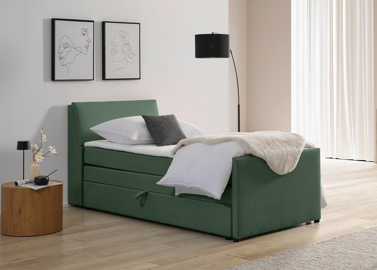 Bettkasten ist eine praktische Ergänzung für mehr Struktur und Ordnung in den eigenen vier Wänden. Machen Sie es sich gemütlich in diesem Boxspringbett (ca. 100 x 200 cm) in Grün mit Bettkasten, Topper und gepolstertem Kopfteil und genießen Sie jede Minute!