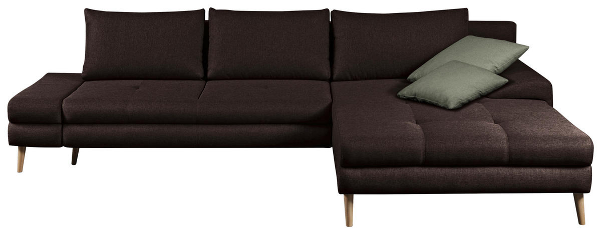 MID.YOU ECKSOFA Dunkelbraun Webstoff Zierkissen, Rückenkissen, Bettkasten, Schlaffunktion, Rücken echt, Stauraum