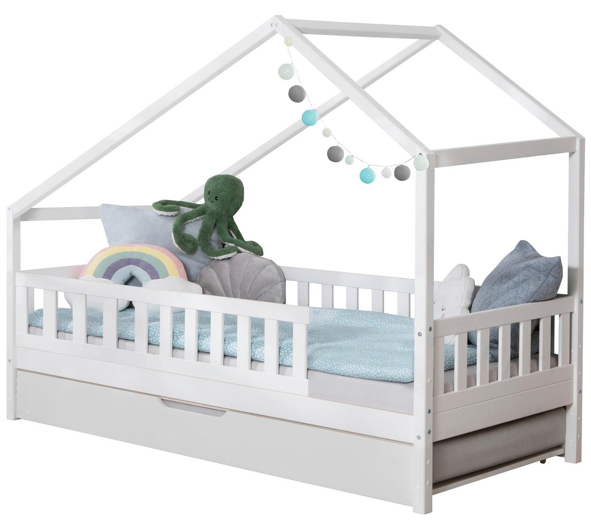 MID.YOU HAUSBETT 100/200 cm, in Weiß, Absturzsicherung, Rollrost, Bettkasten