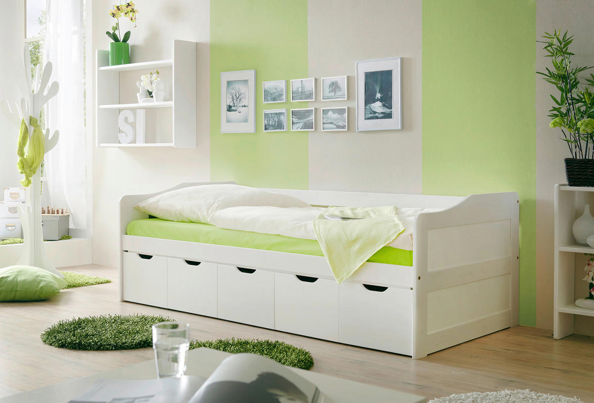 Stauraumbett in Weiß fürs Jugendzimmer mit 5 Schubladen