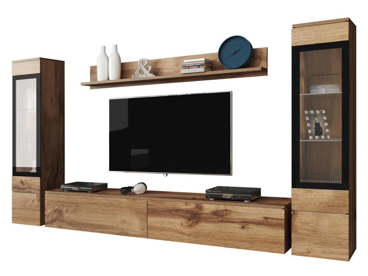 - Set bestehend aus: Wandregal, TV-Lowboard, 2x Hängevitrine