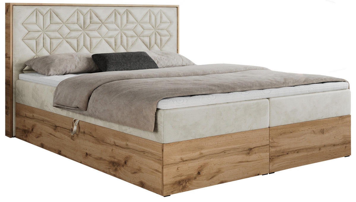 BOXBETT 180/200 cm, in Beige, gepolstertes Kopfteil, Bettkasten, Topper, Matratzen, H3 + H3 = fest