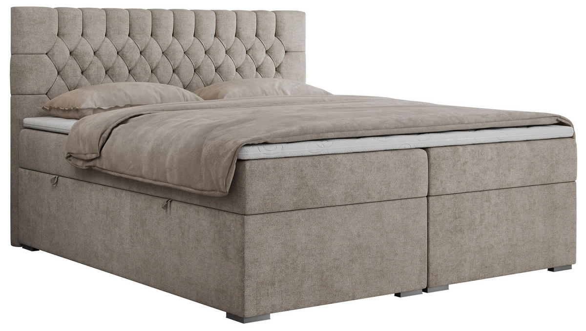 BOXBETT 180/200 cm, in Beige, gepolstertes Kopfteil, Bettkasten, Topper, Matratzen, H3 + H3 = fest