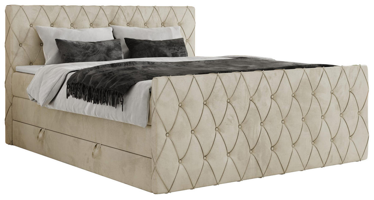 BOXBETT 160/200 cm, in Beige, Matratzen, Topper, Bettkasten, gepolstertes Kopfteil, H3 + H3 = fest