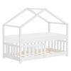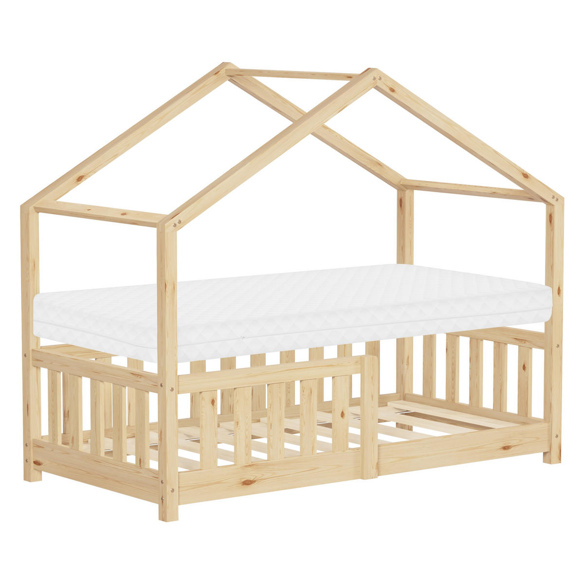 Dieses stilvolle Kinderbett in Hausform mit Matratze schafft eine gemütliche Wohlfühlatmosphäre im Kinderzimmer. Das offene Holzgestell in Form eines Hausdachs lädt nicht nur zum Schlafen, sondern auch zum Spielen und Träumen ein. Gefertigt aus stabilem Kiefernholz mit einem Lattenrost aus robustem Sperrholz bietet das Bett eine sichere und langlebige Schlafmöglichkeit für Kinder. Mit einer Liegefläche von 70 x 140 cm ist es ideal für Kleinkinder und Vorschulkinder geeignet. Ob als Rückzugsort, Abenteuerhöhle oder klassisches Bett – dieses Modell vereint Funktionalität mit kindgerechtem Design.Diese Kindermatratze lässt deinen Kindern den wohlverdienten Erholungsschlaf bekommen, den sie brauchen. Die Kaltschaummatratze bietet eine gesunde Unterstützung für Kopf, Nacken, Rücken und Beine. Der Matratzenkern ist aus hochwertigem, hypoallergenem Kaltschaum und ist somit bestens geeignet für Allergiker. Sollten Verunreinigungen auf der Matratze geschehen, kannst du den Steppbezug mithilfe des Reißverschlusses einfach abnehmen und in die Waschmaschine geben.Der Bezug der Kinderschaumstoffmatratze ist abnehmbar und waschbar. Mittels eines Reißverschlusses an einer der beiden Kurzseiten kann der Bezug geöffnet und problemlos abgezogen werden. Der Bezugsstoff besteht zu 100 % aus Polyester.Die hochwertige Komfortschaummatratze ist gleichermaßen für Baby- und Kinderbetten mit den Maßen 70 cm x 140 cm geeignet. Beide Liegeseiten sind mit der gleichen Stützkraft ausgestattet, so ist die Matratze beliebig drehbar und wendbar.Schadstoff geprüft: Diese Kindermatratze wurde mit dem Oeko-Tex Standard 100 ausgezeichnet. Das heißt die Matratze besteht aus schadstofffreien Materialien und ist somit zu 100% gesundheitlich unbedenklich.Deine Vorteile im ÜberblickHausdach-Design: Ein echter Hingucker und kreativer Spielort im Kinderzimmer.Stabiles Holzgestell: Gefertigt aus massivem Kiefernholz für zuverlässige Stabilität.Mit Lattenrost: Im Lieferumfang enthalten – sofort einsatzbereit.Für Matratzen 70x140 cm: Ideal für Kleinkinder bis ca. 6 Jahre.