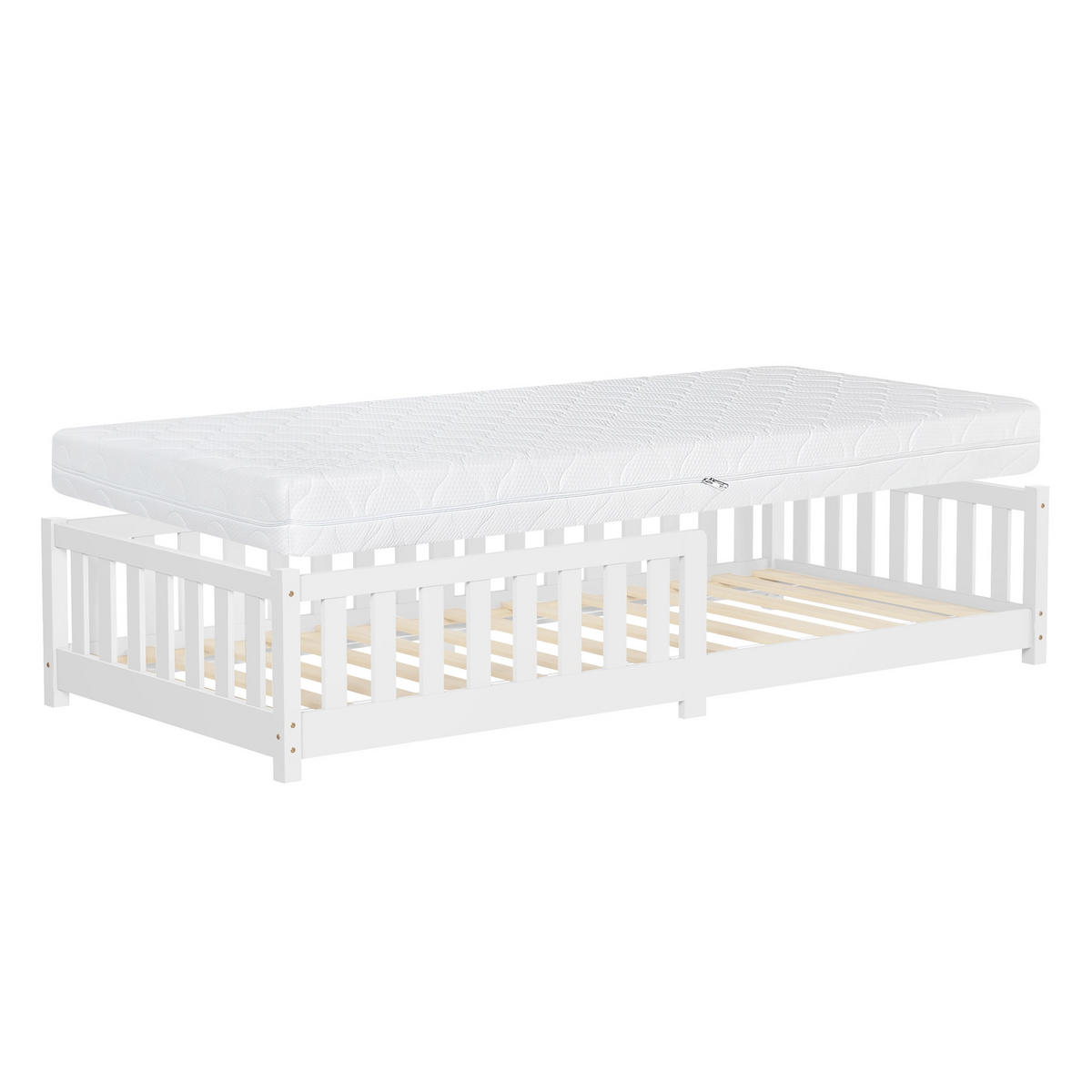 Kinderbett mit Matratze und Rausfallschutz – 90 x 200 cm, aus massivem KiefernholzDieses stilvolle und sichere Kinderbett bietet perfekten Schlafkomfort für Kinder und Jugendliche. Mit seinem stabilen Rahmen aus massivem Kiefernholz und dem integrierten Rausfallschutz sorgt es für erholsame und sichere Nächte.