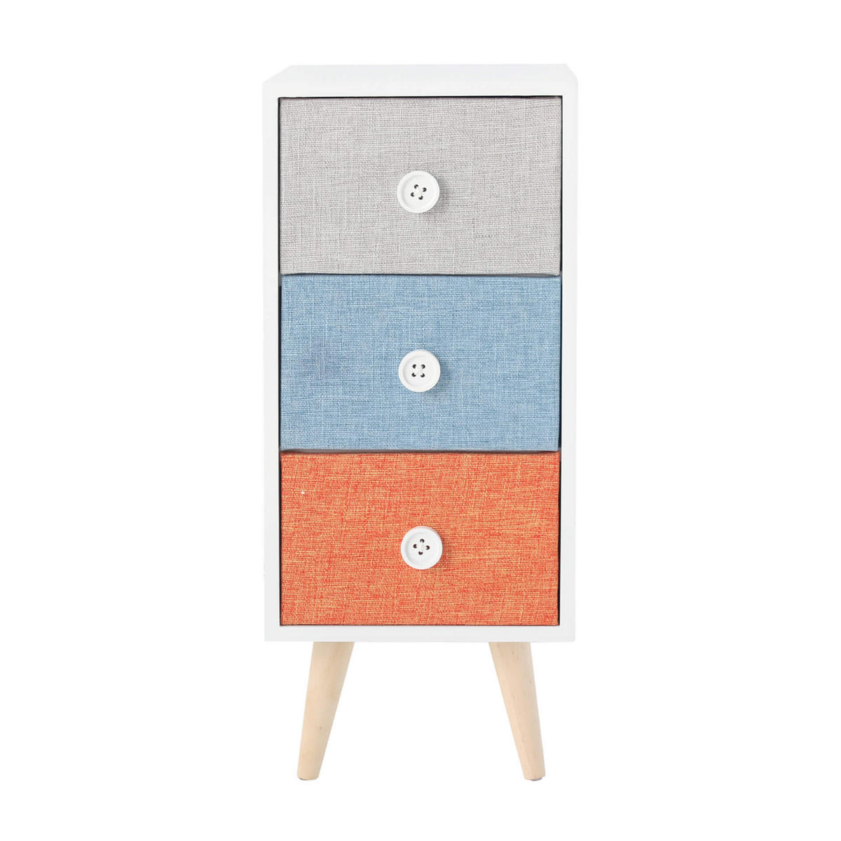 SPEZIFIKATIONENS: Maße: H 59 × B 25 × T 25 cm - Maße Schubladen: H 14,5 × B 24 × T 20 cm - Material: MDF, Kiefernholz, Stoff - Farbe: Weiß Grau Hellblau Orange - Code RE6669