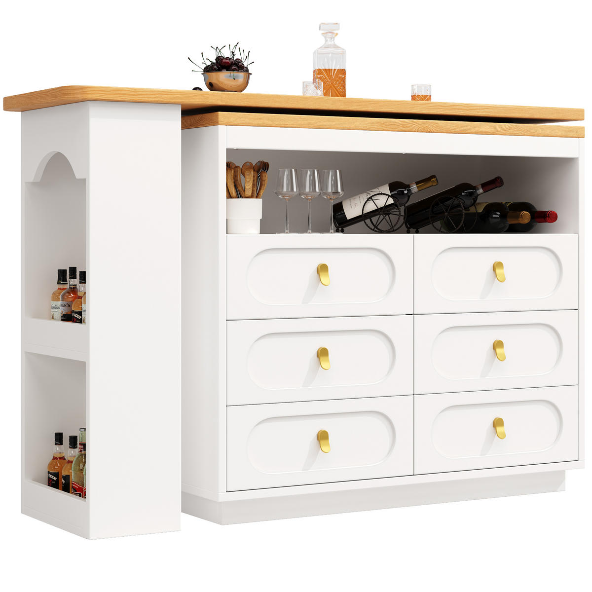 Dieser moderne Esszimmerschrank im eleganten Weiß kombiniert stilvolles Design mit flexibler Nutzung. Die dekorativen Schranktüren mit Metallgriffen und die Tischplatte mit feinem Muster setzen wohnliche Akzente – ideal für moderne, industrial oder skandinavische Einrichtungen. Dank ausziehbarer Länge und stabilem 360°-Drehmechanismus eignet sich das Möbel sowohl zum gemeinsamen Servieren als auch als funktionaler Arbeitsplatz. Mit 6 Schubladen und seitlichem Snack-Regal bleibt Zubehör übersichtlich verstaut – perfekt für Küche, Essbereich, Wohnzimmer oder Homeoffice.