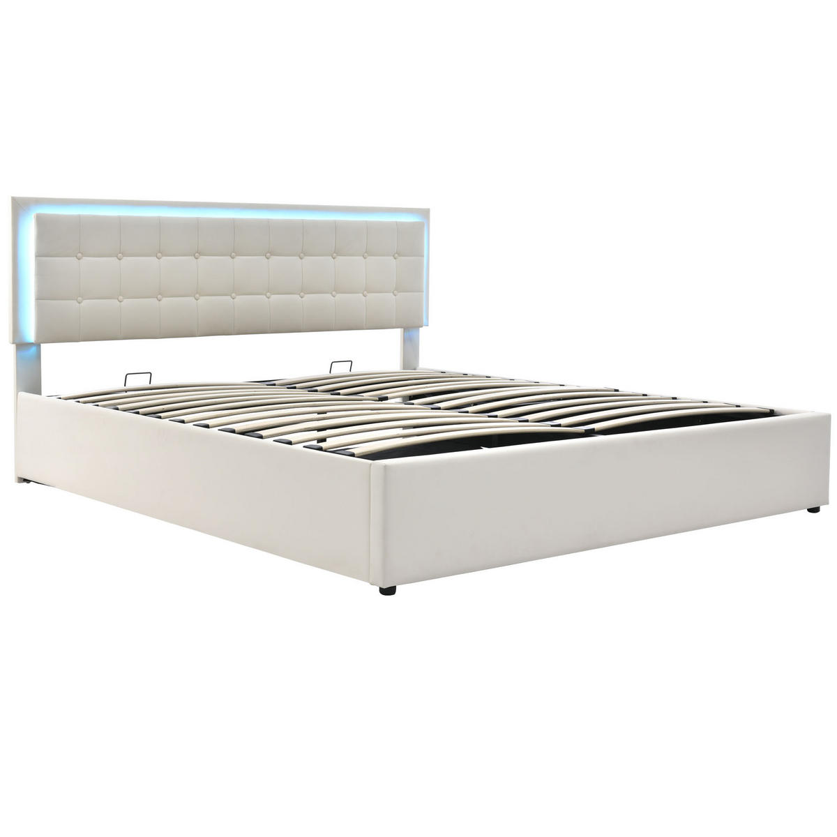 Dieses Polsterbett präsentiert sich in modernem Stil und setzt mit dem gesteppten Kopfteil sowie der integrierten LED-Beleuchtung einen eleganten Akzent im Schlafzimmer. Per Fernbedienung lassen sich verschiedene Farben und Helligkeiten anpassen. Der Bettkasten mit Hydraulikstange bietet geschützten Stauraum für Kleidung und Bettwäsche. Der Bezug aus PU-Kunstleder ist wasserabweisend und pflegeleicht. Eine Konstruktion aus , Metall und elastischen Kiefern-Latten unterstützt Stabilität und ein komfortables Liegegefühl. Der Oxford-Stoff im Stauraum hilft, Schimmel und Stockflecken vorzubeugen; regelmäßiges Auslüften wird empfohlen. Zur Reinigung genügt ein weiches, leicht feuchtes Tuch.Details:
