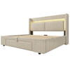 Dieses Polsterbett in modernem Stil verbindet elegantes Design mit praktischen Funktionen für ein komfortables Schlafzimmer. Das gepolsterte Kopfteil bietet offene und geschlossene Aufbewahrungsmöglichkeiten sowie Ladeanschlüsse mit USB und USB-C. Der integrierte LED-Lichtstreifen mit 16 Farben, einstellbarer Helligkeit und verschiedenen Modi sorgt für eine angenehme Atmosphäre. Zusätzlichen Stauraum bieten das hydraulisch anhebbare Bettfach und eine Schublade auf Rollen. Der stabile Rahmen aus Metall, latten und EVA-Silent-Pads unterstützt eine ruhige Nutzung und verhindert zusammen mit der vorderen Abtrennung am Kopfteil das Verrutschen der Matratze. Zur Reinigung empfiehlt sich ein weiches, leicht angefeuchtetes Tuch.Details: