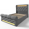 Dieses Polsterbett verbindet klassisch-elegantes Design mit moderner Funktionalität. Das Kopf- und Fußteil mit rautenförmiger Knopfheftung, stromlinienförmigen Seiten am Kopfteil und zylindrischem Fußteil setzen stilvolle Akzente im Schlafzimmer. Der weiche Samtbezug sorgt für eine angenehme Haptik. Integrierte LED-Lichtstreifen an Kopf- und Fußende bieten verschiedene Lichtmodi, Timer-Funktion sowie Farbwahl per App oder Fernbedienung. Zusätzlich erleichtern USB- und Type-C-Anschlüsse auf beiden Seiten das Laden mobiler Geräte direkt am Bett. Der hydraulisch anhebbare Lattenrost schafft praktischen Stauraum unter dem Bett, ergänzt durch ein staubdichtes Tuch. Eisenstangen am Kopfteil und seitliche Rillen unterstützen einen stabilen Halt der Matratze. Der abnehmbare Samtbezug unter dem Kopfteil reduziert das Verrutschen von Kissen. Zur Reinigung empfiehlt sich ein weiches, leicht angefeuchtetes Tuch; bitte nur milde Reinigungsmittel verwenden.Details: