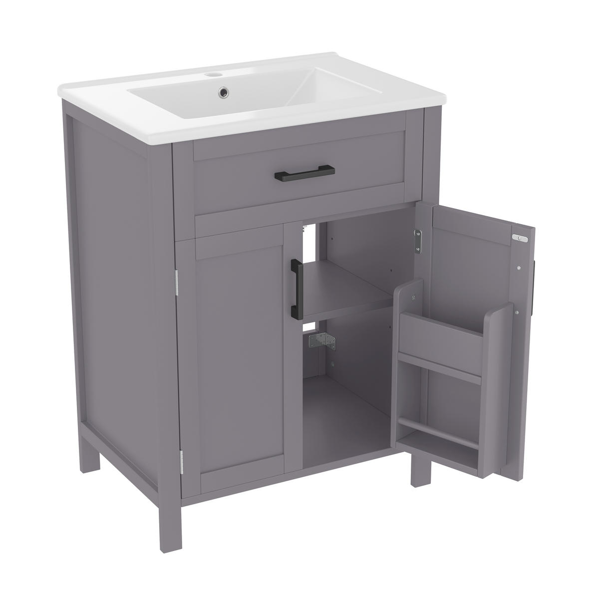 Dieser freistehende Waschtischkombi im modernen, grauen Design besteht aus hochwertigem MDF mit feiner Sprühlackierung für eine glatte, feuchtigkeitsbeständige Oberfläche. Er verfügt über ein integriertes Keramikwaschbecken und ist mit schwarzen