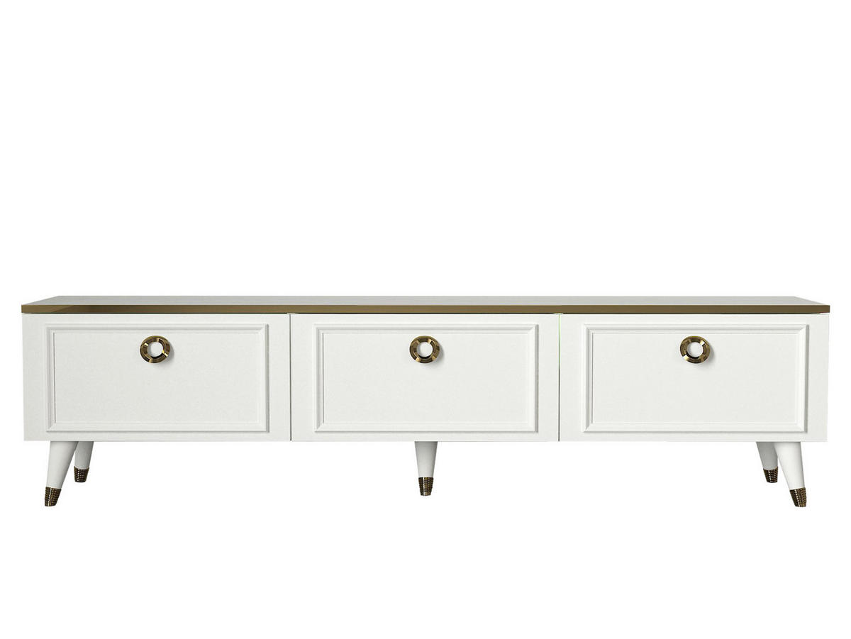 Das TV Lowboard Cornelia besticht durch sein elegantes Design in hochglänzendem Weiß mit goldenen Akzenten. Die Kombination aus modernen Elementen und klassischer Eleganz macht dieses Möbelstück zum perfekten Blickfang in jedem Wohnzimmer. Maße des TV Lowboards (B/H/T): 180 cm / 46,3 cm / 35 cm Farbe Weiß mit goldenen Akzenten Stil Modern Produktdetails Edles Design mit hochwertigen Materialien Hochwertige Melamin-beschichtete Platte (18 mm, Güteklasse E1) für Langlebigkeit Speziell entwickelte Griffe und Füße für ein einzigartiges Erscheinungsbild Drei großzügige Schubladen für optimalen Stauraum Stabile Konstruktion mit schräg gestellten Beinen für eine elegante Optik Hinweis Leichte Abweichungen der dargestellten Bilder sind möglich, bedingt durch Monitoreinstellungen.