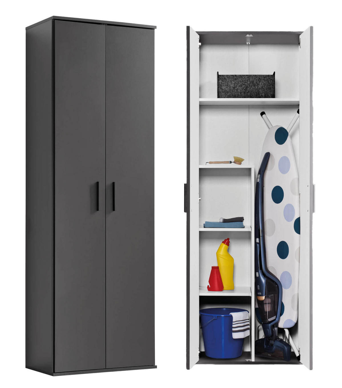 - Besonderheiten: in Schwarz / Anthrazit, Besenschrank, Putzschrank o. Haushaltsschrank