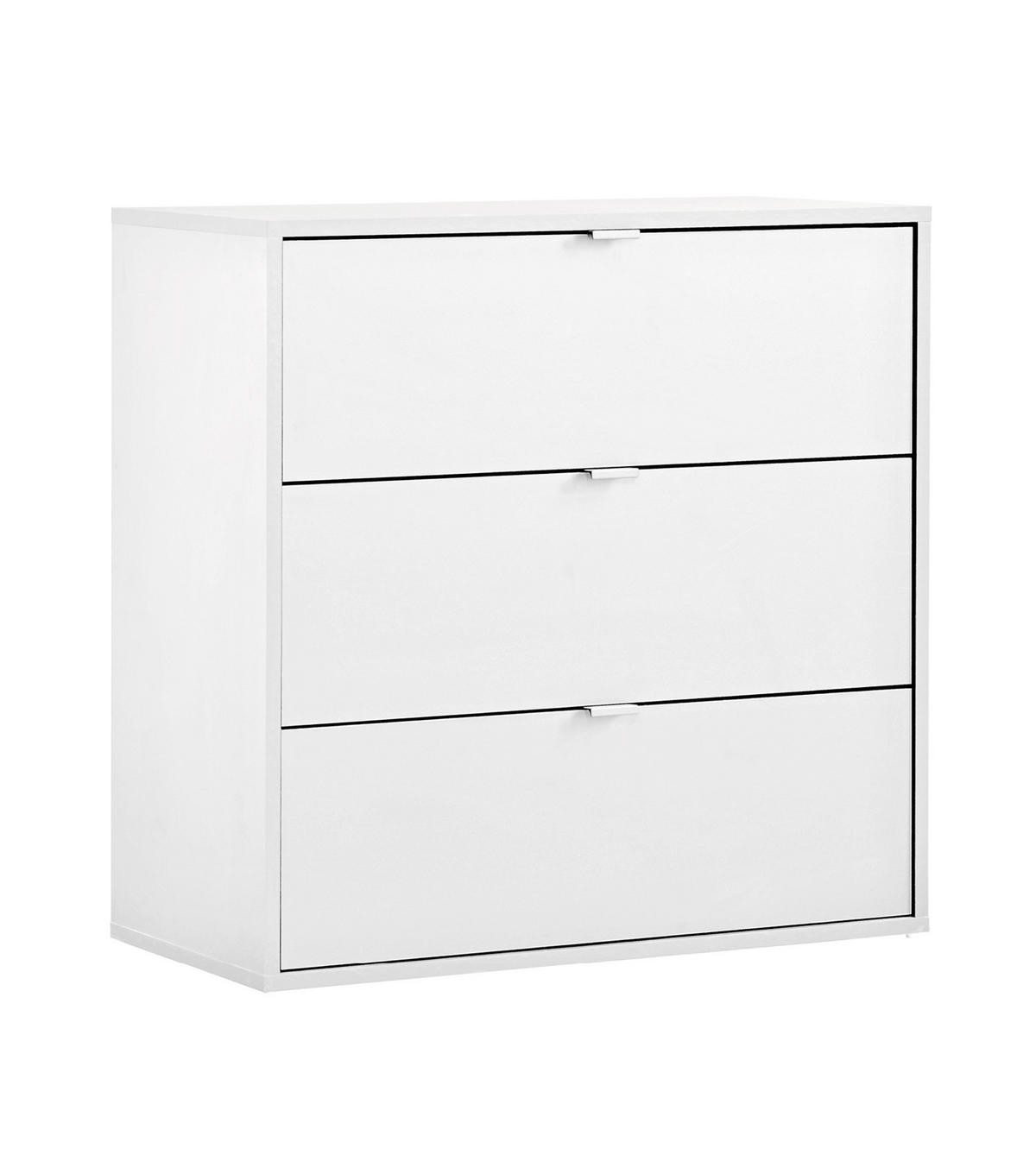- Materialzusammensetzung: Korpus & Fronten aus Spanplatte mit beständiger Melaminbeschichtung in Alpinweiß oder Anthrazit. Pulverbeschichtete Metallgriffe.