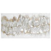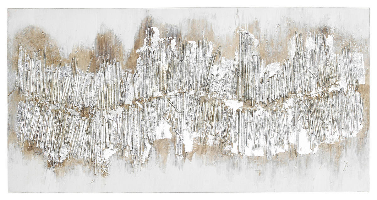 Extraordinär ist der beste Ausdruck für dieses handgemalte Ölgemälde. Die ca. 60 x 120 cm große Leinwand zeigt auf silberfarbenem Hintergrund ein abstraktes Motiv, das Ihre Fantasie ankurbeln wird. Sicher werden Sie und Ihre Freunde rätseln, was der Maler mit dem Bild aussagen möchte. Ist das nicht ein guter Einstieg für ein Gesprächsthema? Die Leinwand ist auf einem Rahmen aus Tannenholz befestigt und kann somit spielend leicht an der Wand montiert werden. Ob als Blickfang über einer Kommode oder zur Ausschmückung des Esszimmers - mit diesem Gemälde landen Sie einen Volltreffer!
