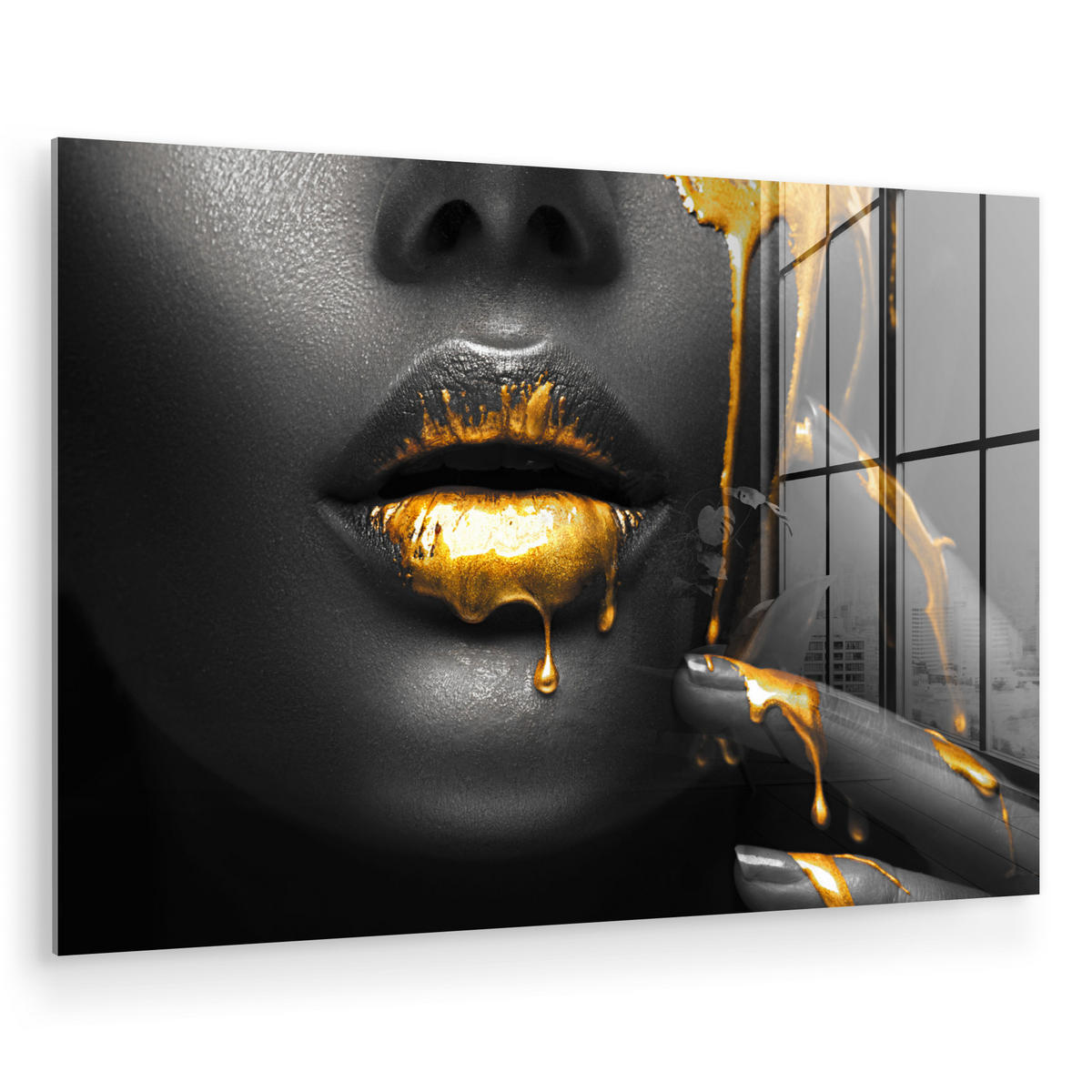 Gesicht einer Frau in Schwarz mit goldenen Lippen
