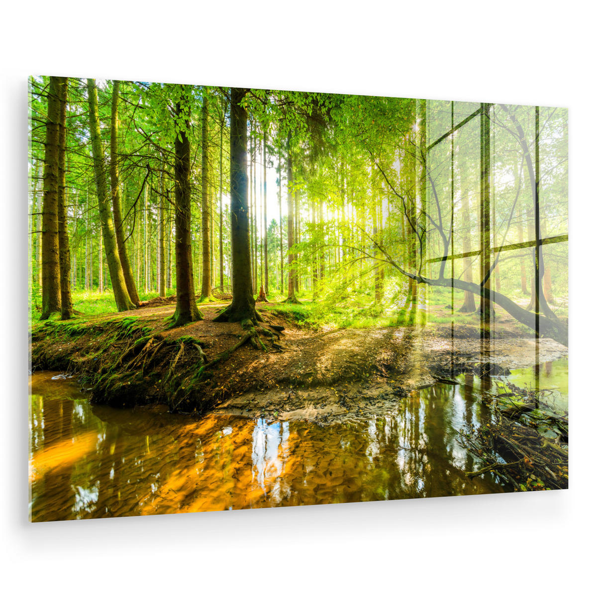 ACRYLGLASBILD Wald - Landschaft - Wasser - Bäume - Sonne - Grün - Natur Room Decor 90x60 cm - Grün, Glas (90/60cm) - MuchoWowMuchoWow