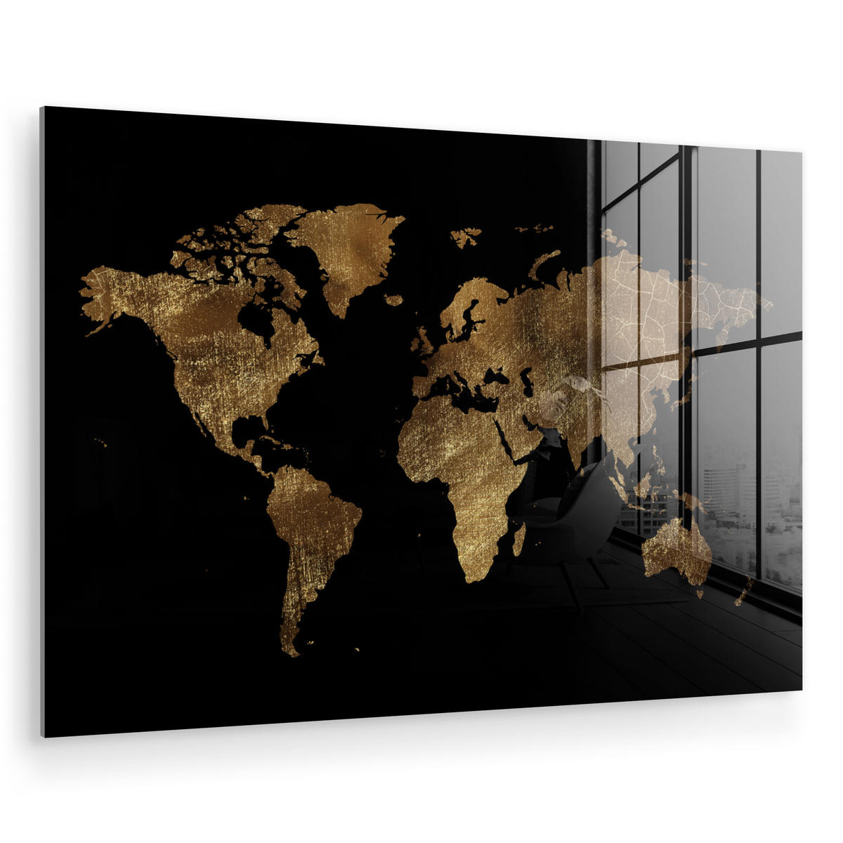 Luxuriöse Weltkarte Gold auf schwarzem Hintergrund. Die Karte ist goldfarben und enthält auch Glitzer.