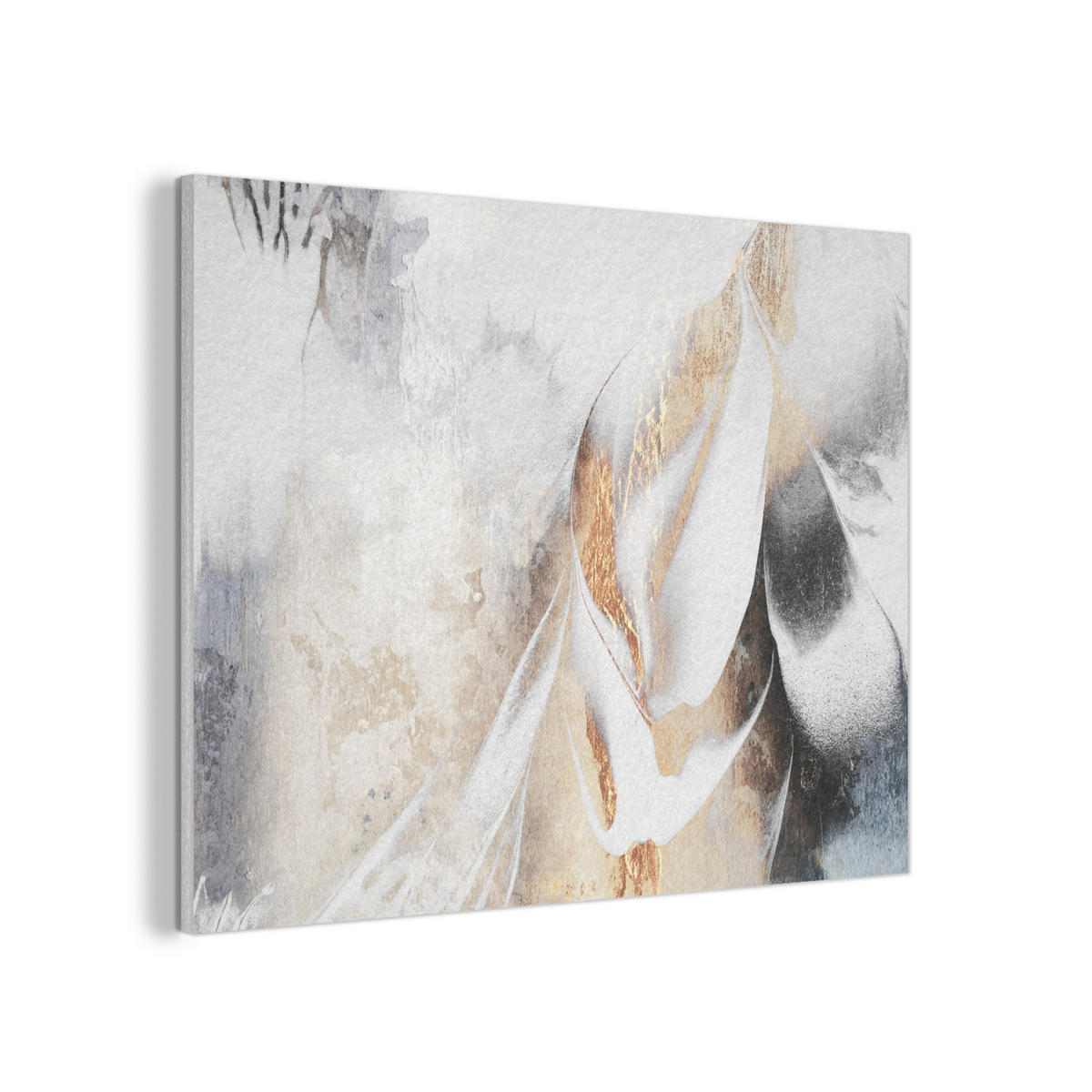 Der Druck zeigt ein abstraktes Design mit weißen und goldenen Details.