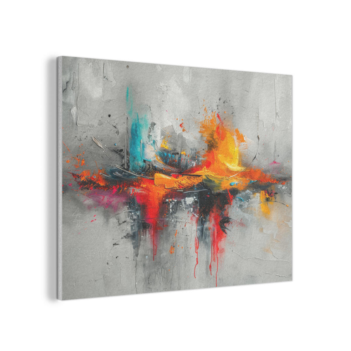 Ein modernes abstraktes Kunstwerk mit kräftigen orangefarbenen Akzenten auf grauem Hintergrund.