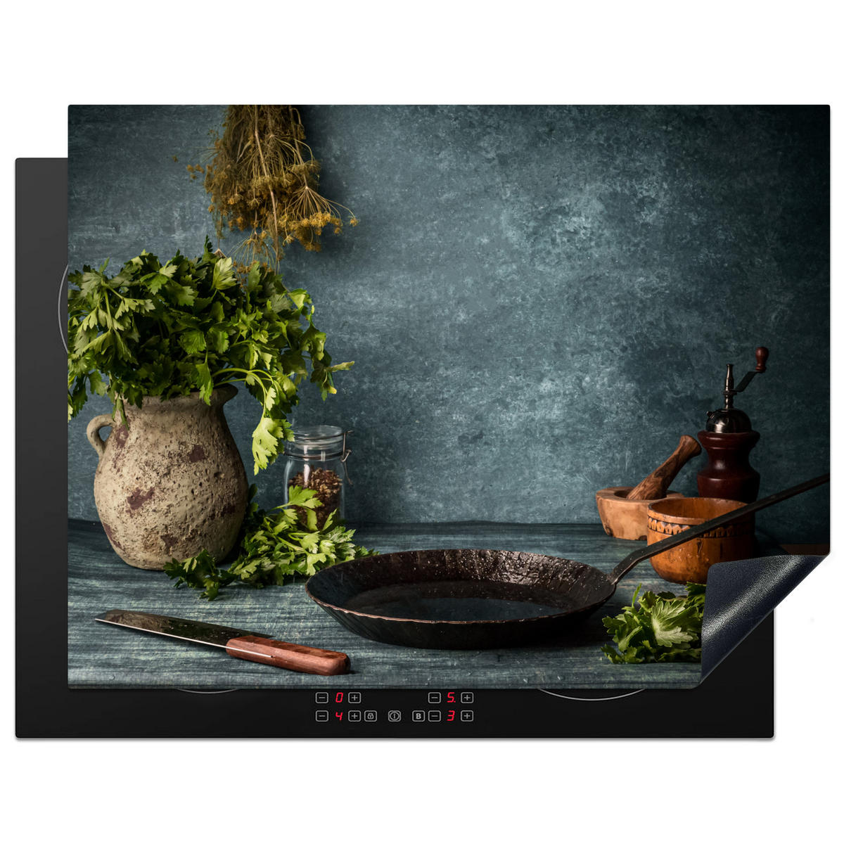 HERDABDECKPLATTE Kräuter - Gewürze - Pfanne - Messer - Grau - Rustikal Induktionsmatte 77x59 cm - Petrol, Kunststoff (77/59/0.2cm) - MuchoWowMuchoWow