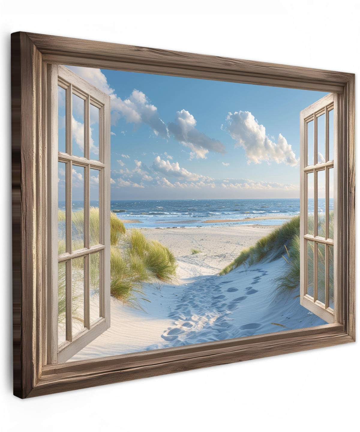 Blick auf einen Strand bei blauem Himmel, gesehen durch ein offenes Fenster. Ein Strandweg führt durch die Dünen zum ruhigen Meer, mit kühlen Farben am Himmel und Spiegelungen auf dem Wasser.