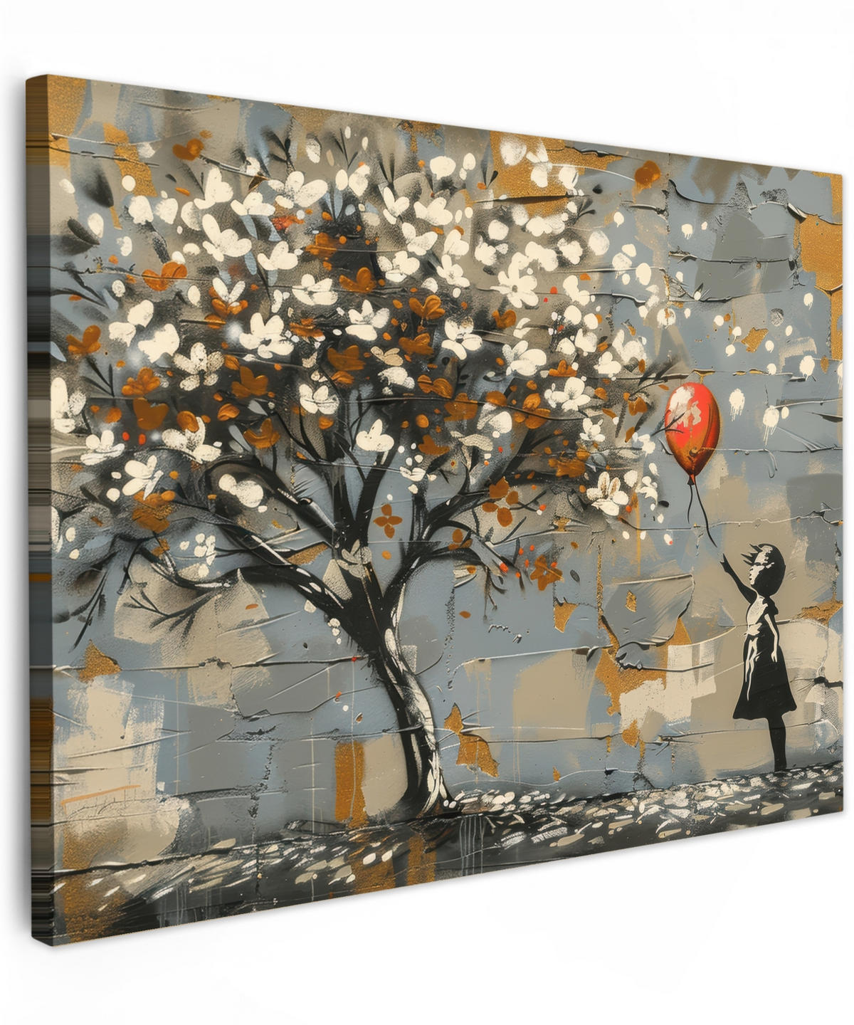 Ein Graffiti im Banksy-Stil, das einen Baum mit einem Mädchen zeigt, das einen Luftballon hält.