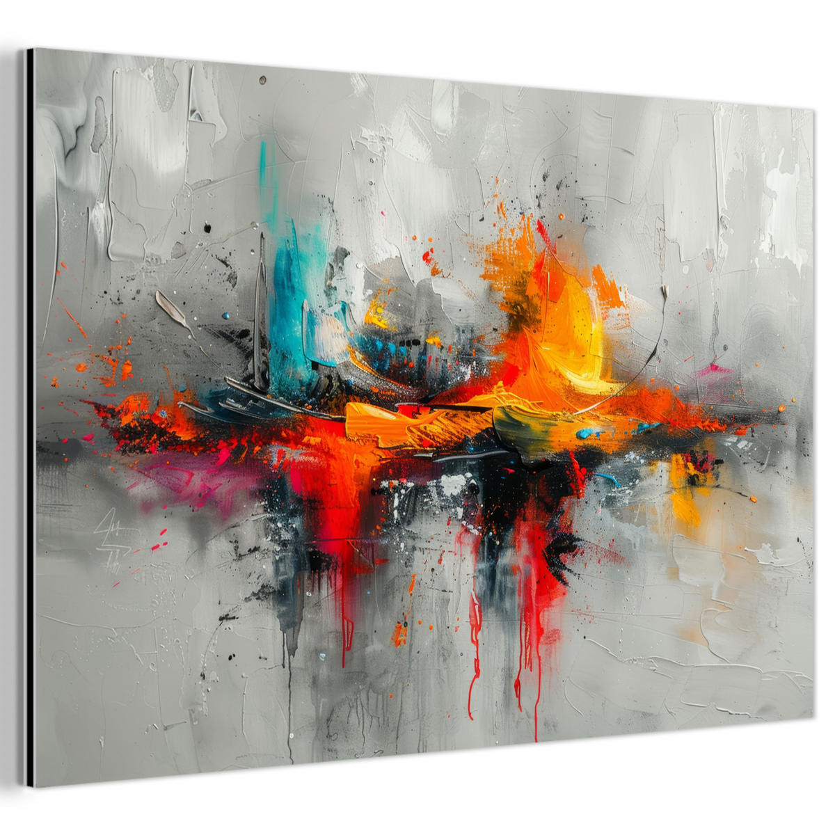 Ein modernes abstraktes Kunstwerk mit kräftigen orangefarbenen Akzenten auf grauem Hintergrund.