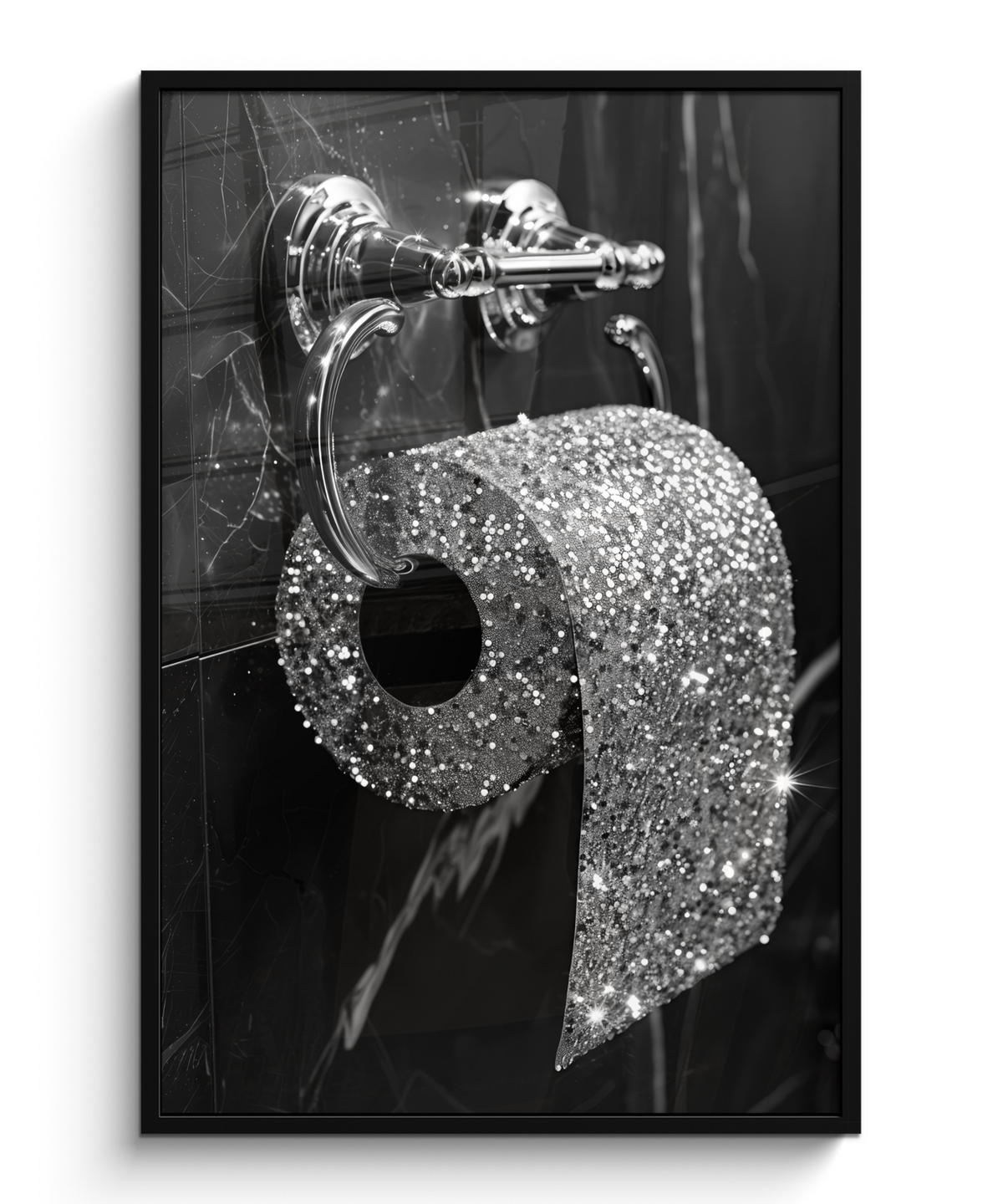 POSTER MIT RAHMENGERAHMTES BILD WC - Toilettenpapier - Schwarz und weiß - Glitter Bilderleiste 80x120 cm - Silberfarben, Papier (80/120cm) - MuchoWow