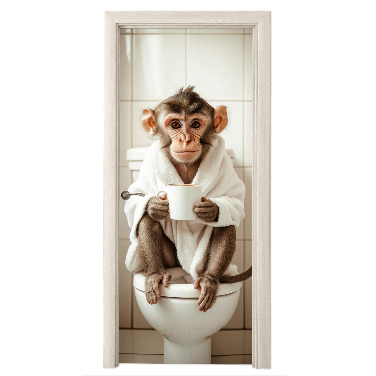 Über das Bild Ein Affe im Bademantel sitzt mit einer Tasse Kaffee auf der Toilette.