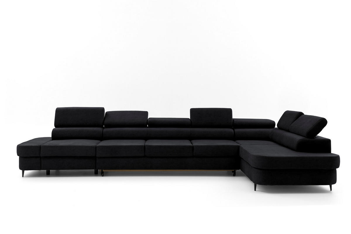 Vena 20 (Schwarz) – einem samtweichen Velvet-Stoff, der jedem Interieur eine warme, luxuriöse Note verleiht. Dank schlanker Füße, filigraner Armlehnen und einer hohen Rückenlehne wirkt das Sofa trotz seiner Größe leicht und raumfreundlich.