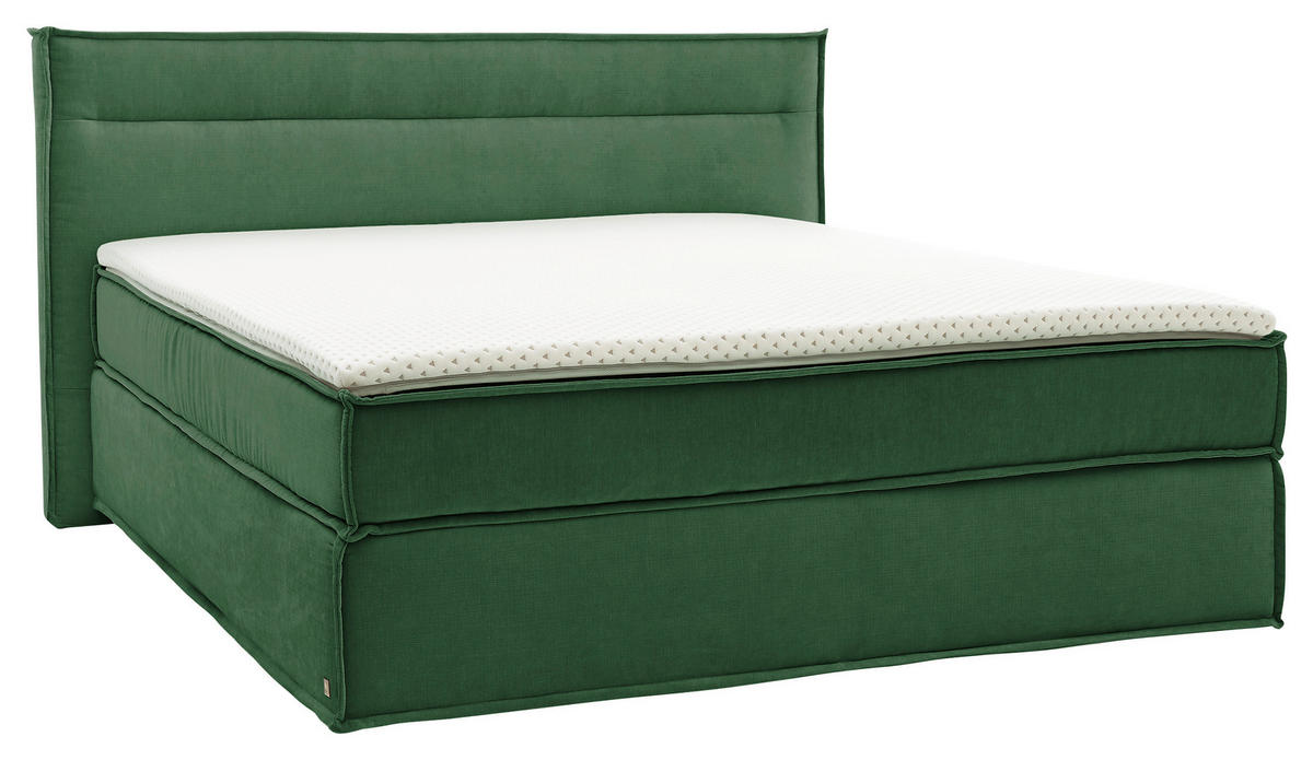 Quersteppung lädt zum Verweilen ein. Rein in die Komfortzone: Dieses MUSTERRING Boxspringbett (ca. 200 x 200 cm) in Grün mit Topper und gepolstertem Kopfteil entführt Sie auf ein traumhaftes Terrain zum geruhsamen Durchatmen!