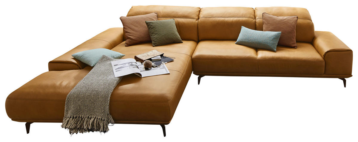 Im Lieferumfang enthalten: Genießen Sie Ihr Rendezvous mit der wohligen Unbeschwertheit des Seins auf diesem gelben Ecksofa von MUSTERRING mit Leder-Bezug!
