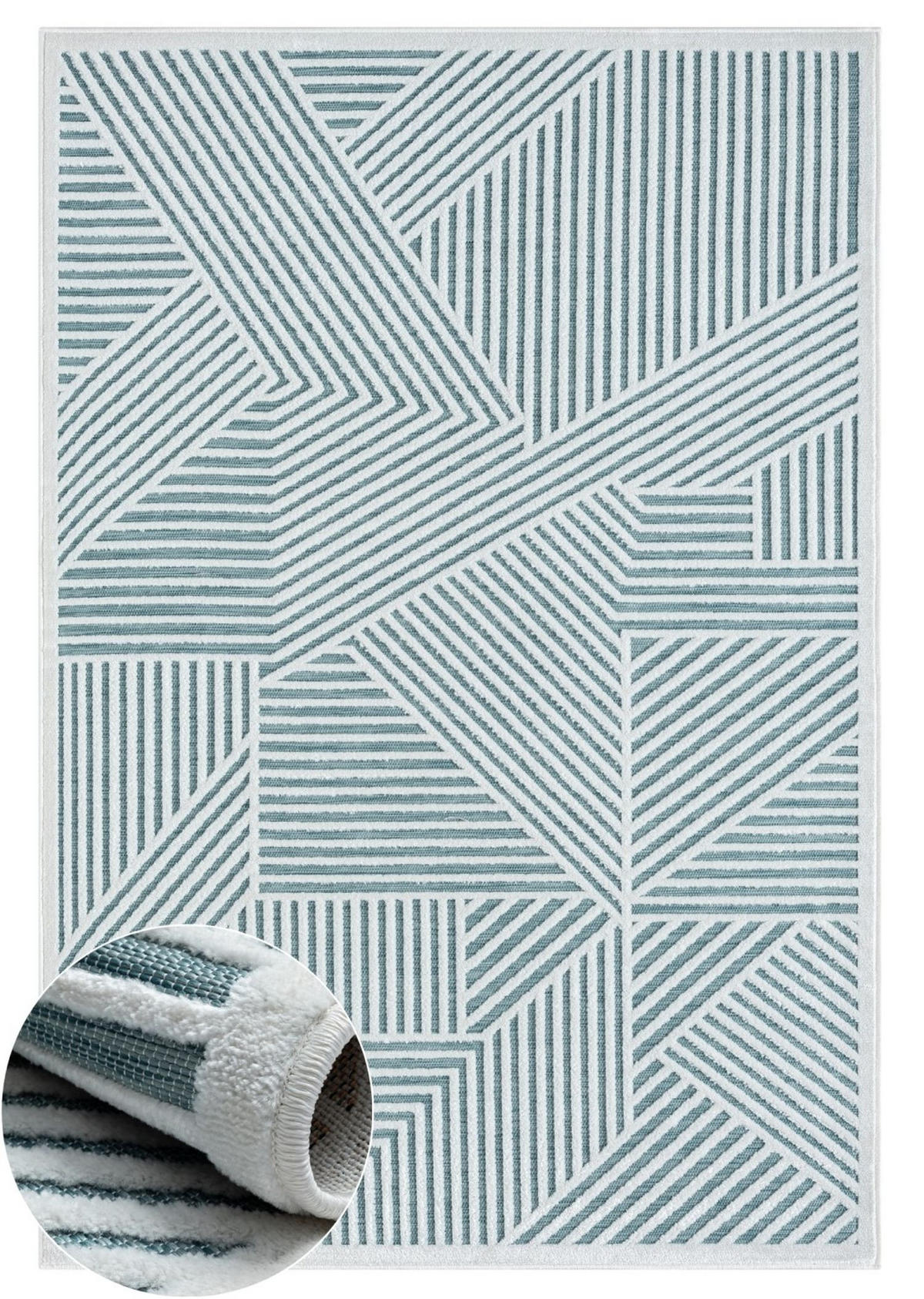Die Teppichserie Audrey II kombiniert klare Geometrie mit einer frischen, modernen Farbgebung in Aquagrün. Das dynamische Linienmuster erzeugt eine spannende Tiefenwirkung und verleiht Räumen – drinnen wie draußen – Struktur und Leichtigkeit.