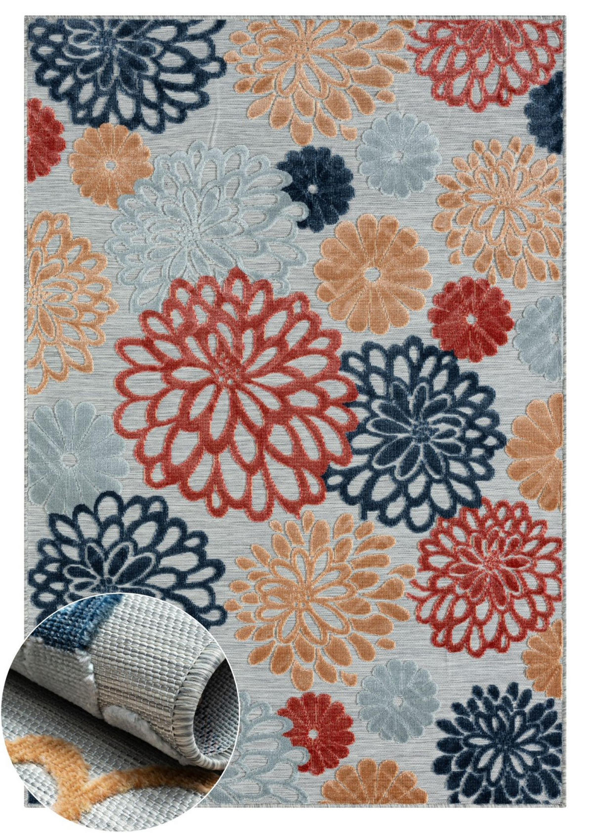 Die Teppichserie Bramble bringt farbenfrohe Frische in den Wohn- und Außenbereich. Das verspielte Blumenmuster in kräftigem Rot, Blau, Orange und Hellblau setzt lebendige Akzente auf Terrasse, Balkon oder im Wohnzimmer und sorgt für eine fröhliche, einladende Atmosphäre.