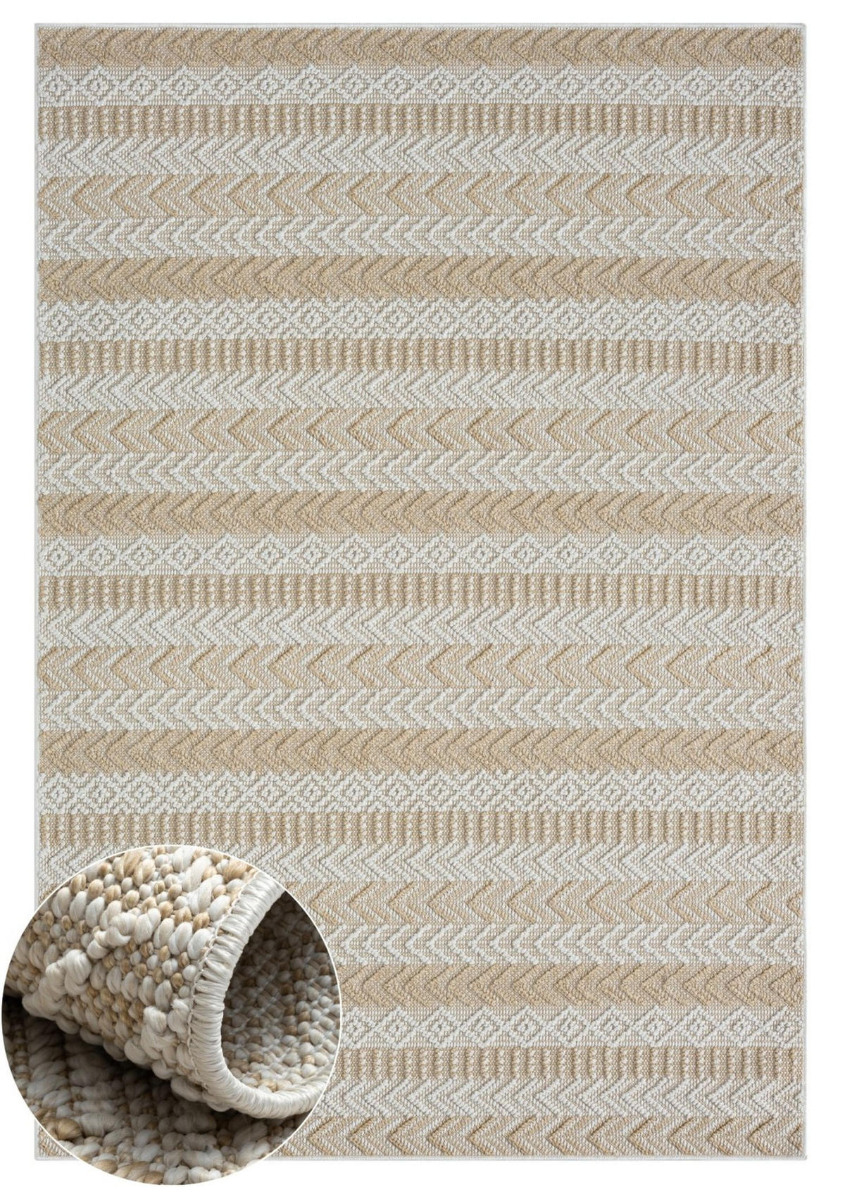 Die Teppichserie Carrie bringt mit ihrem rhythmischen Streifenmuster und natürlichen Beige- und Cremetönen entspannte Harmonie in jeden Wohn- und Outdoorbereich. Die Kombination aus Zickzacklinien, kleinen Ornamenten und klarer Struktur sorgt für ein lebendiges, aber dennoch ruhiges Gesamtbild.