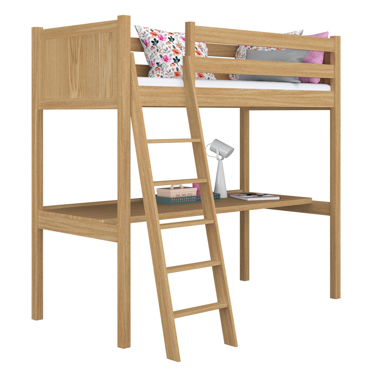 praktischen Schreibtisch aus, der direkt unter dem Bett platziert ist und sich ideal zum Lernen, Arbeiten oder kreativen Zeitvertreib eignet.