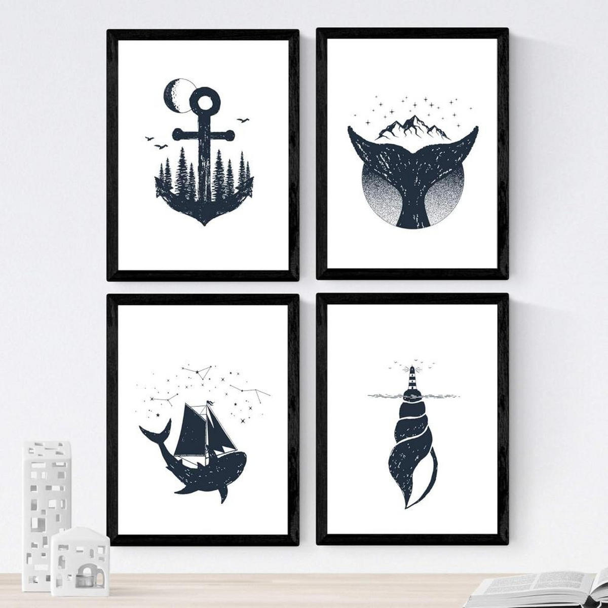 Nacnic POSTER Set mit 4 Natur im nordischen Stil Elemente in blauweiß A4 Schwarzer Rahmen