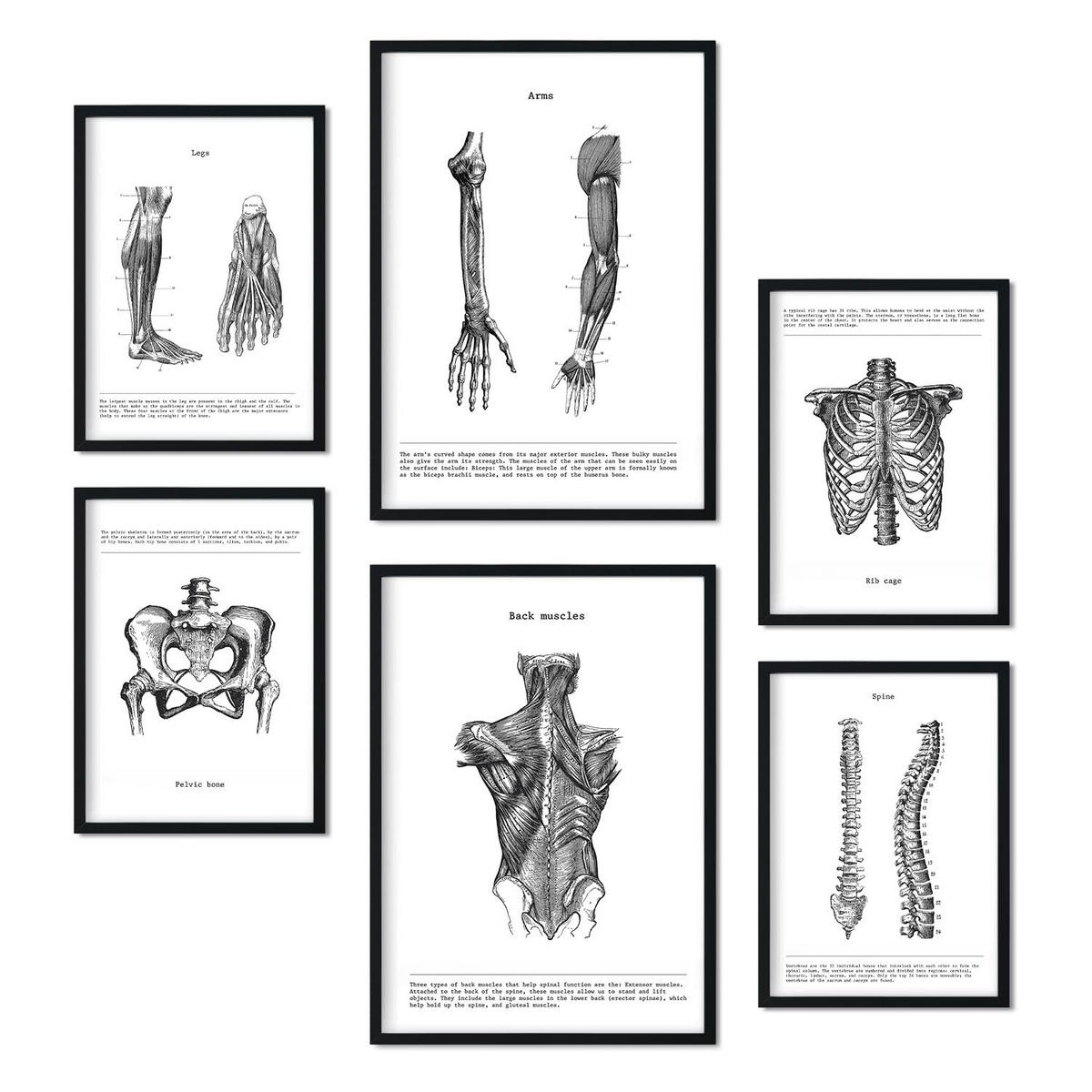 POSTER Set Mit 6 Anatomie Bildern Muskeln Und Knochen Rücken, Bein, Arm, Wirbelsäule, Becken, Rippen Ideal Für Kliniken A3 & A4 Schwarzer Rahmen - Schwarz, Papier (29/3cm) - NacnicNacnic