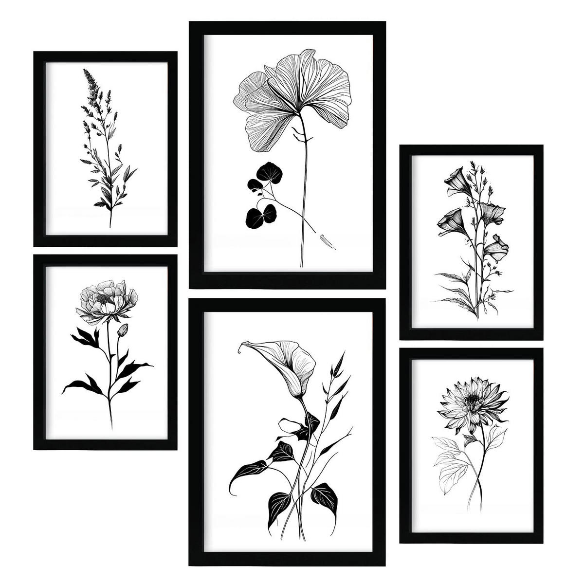 POSTER Set Mit 6 Belaubte Blumen Blumenmotiven In Klassischem Schwarz Und Weiß A3 & A4 Rahmenlos - Klar, Papier (29/3cm) - NacnicNacnic