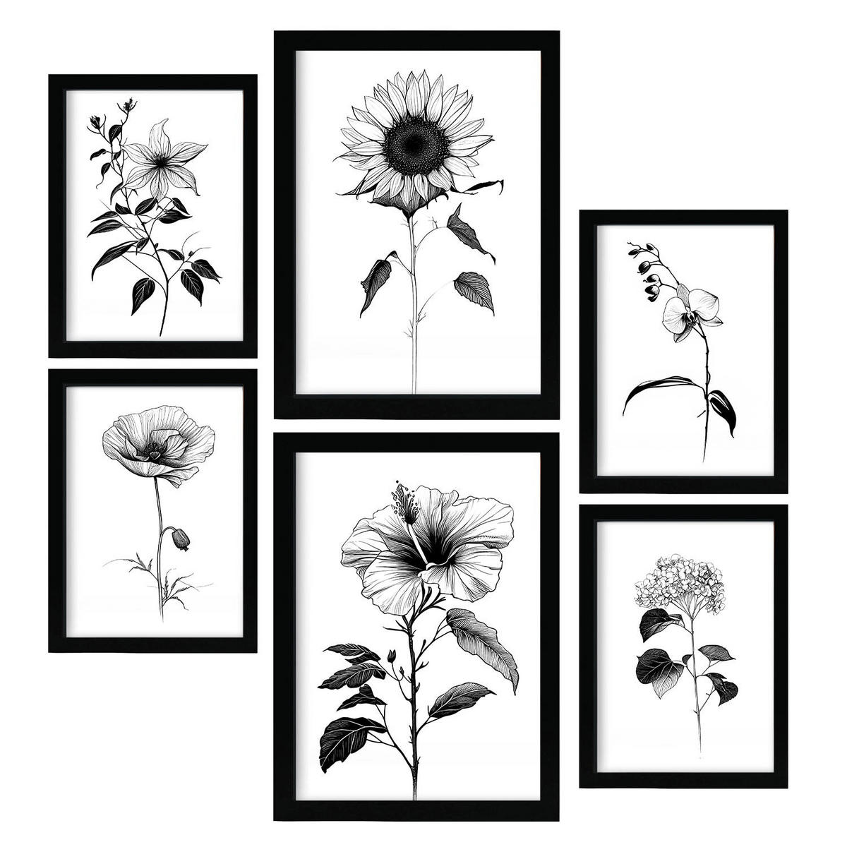 POSTER Set Mit 6 Helle Blumen Natur Und Botanikdrucke Mit Blumenmotiven In Klassischem Schwarz Und Weiß Innenarchitektur A3 & A4 Schwarzer Rahmen - Schwarz, Papier (29/3cm) - NacnicNacnic
