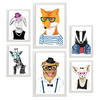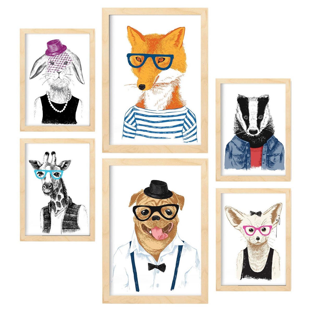 POSTER Set Mit 6 Hipster Tiere Im Farbenfrohen Handgezeichneten Weißer Hintergrunddruck Mit Tieren In Menschlicher A3 & A4 Rahmen Aus Hellem Holz - Beige, Papier (29/3cm) - NacnicNacnic